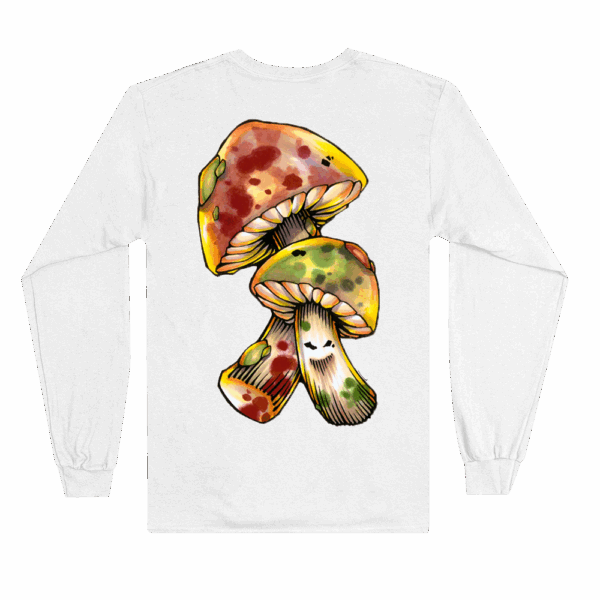 This design features a graffiti Brain Damage logo on the front of a white longsleeve. Back design features a previously unreleased SKAM2? mushroom illustration from original SSLP album illustrations.