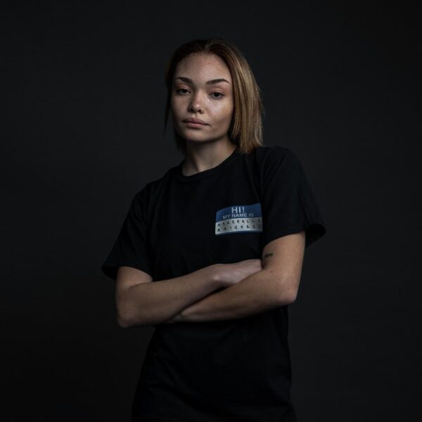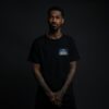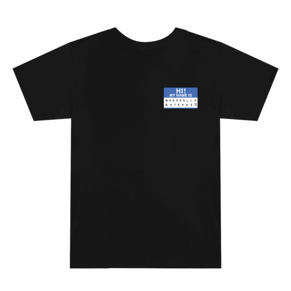 An original “Marshall B. Mathers III” version of the name tag design from 1999 printed on the front left chest of a vintage style black t-shirt.