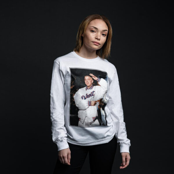 This item features a SSLP era (1999) photo of Eminem printed on the front of a white longsleeve. Both sleeves feature “I’m Shady” text in black down the forearm.
