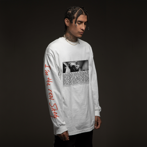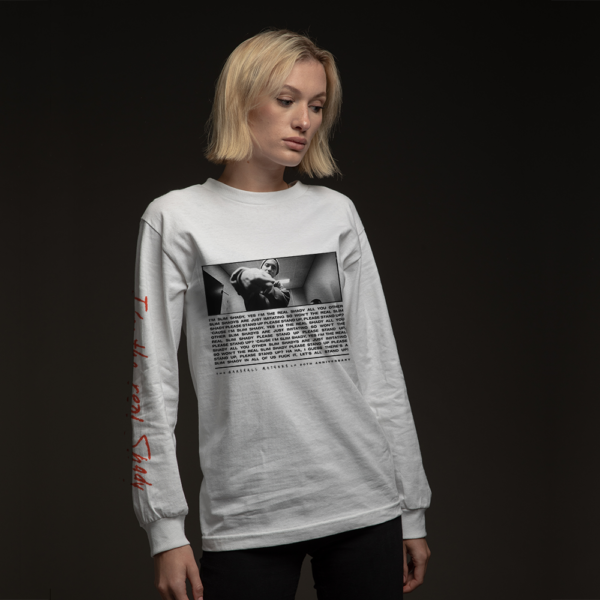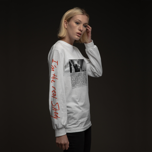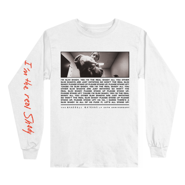 THIS ITEM FEATURES THE REAL SLIM SHADY LYRICS ON FRONT CHEST WITH AN ORIGINAL PHOTOGRAPH FROM PHOTOGRAPHER JONATHAN MANNION, AND THE SLEEVE FEATURES A RED PRINT IN EMINEM’S HANDWRITING FROM HIS ORIGINAL LOOSE LEAF.