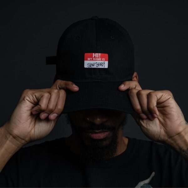 BLACK DAD HAT FEATURING “SLIM SHADY” TARGET LOGO EMBROIDERED ON FRONT.