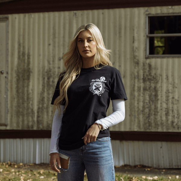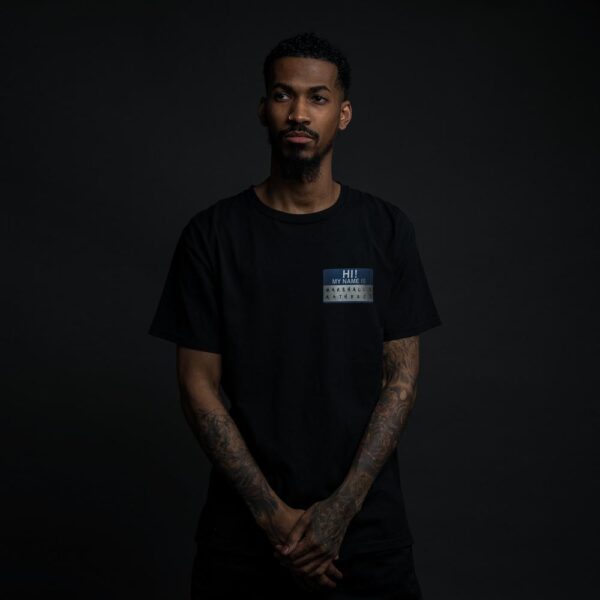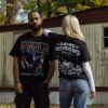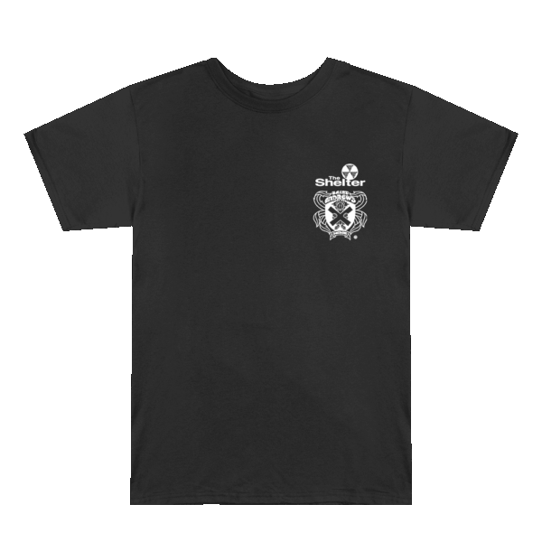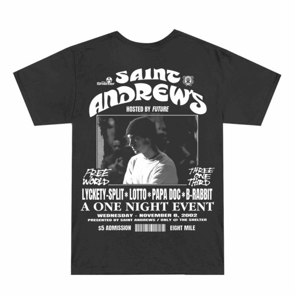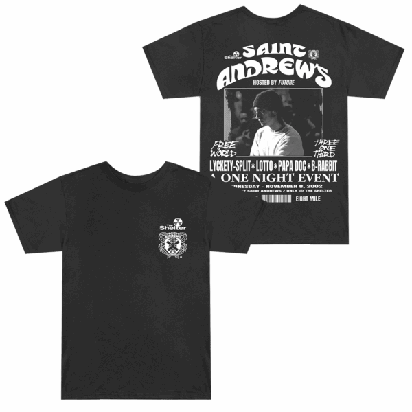 Black t-shirt featuring St. Andrews text on front, and St. Andrews imagery on back of garment.